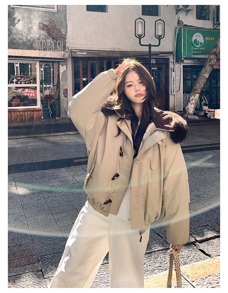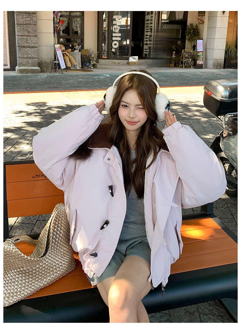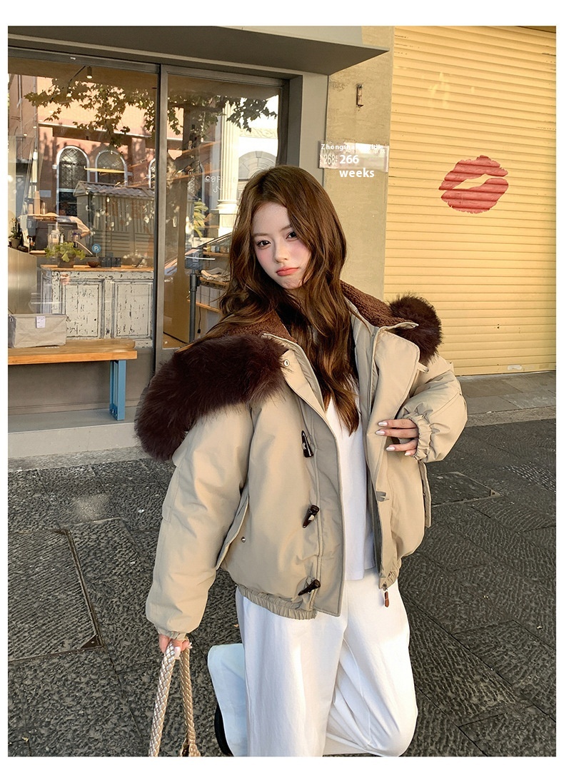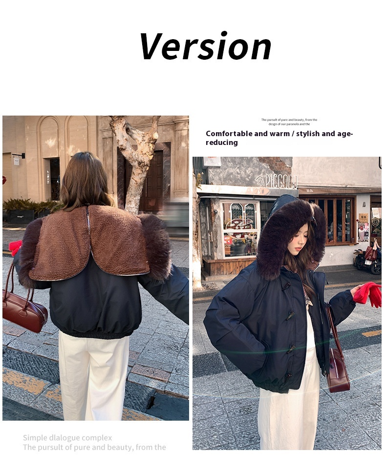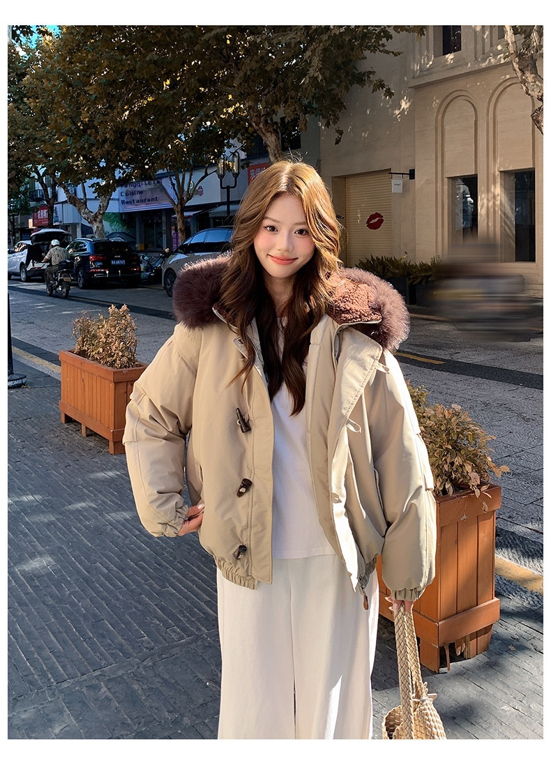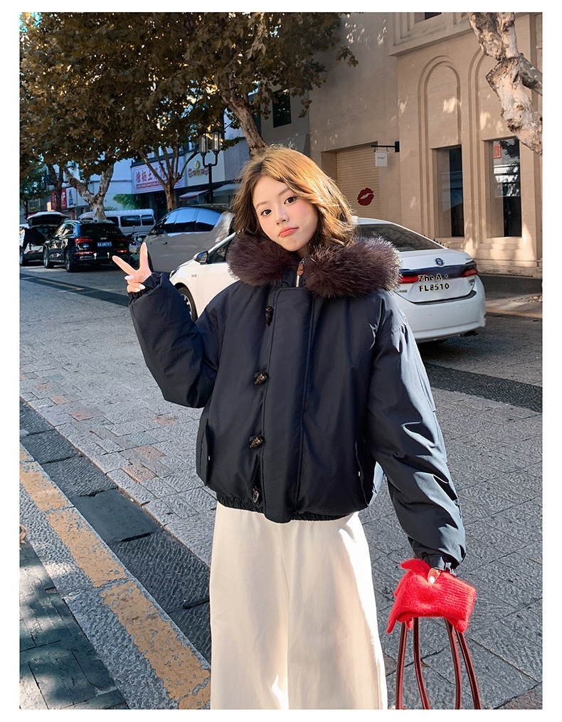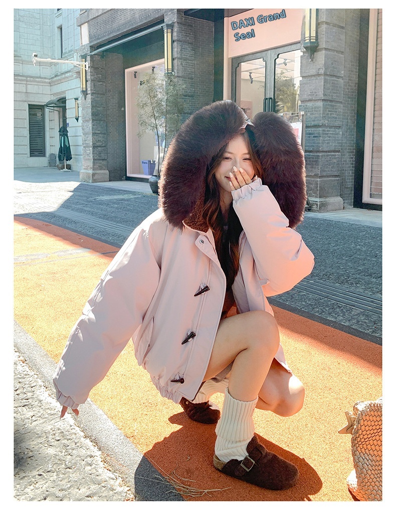 Big Fur Collar Hooded Horn Button Cotton-padded Jacket Women's Casual Loose