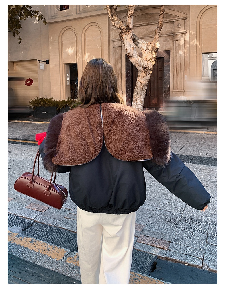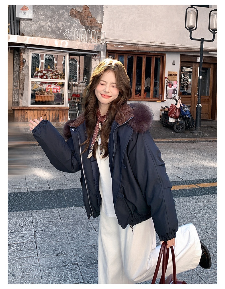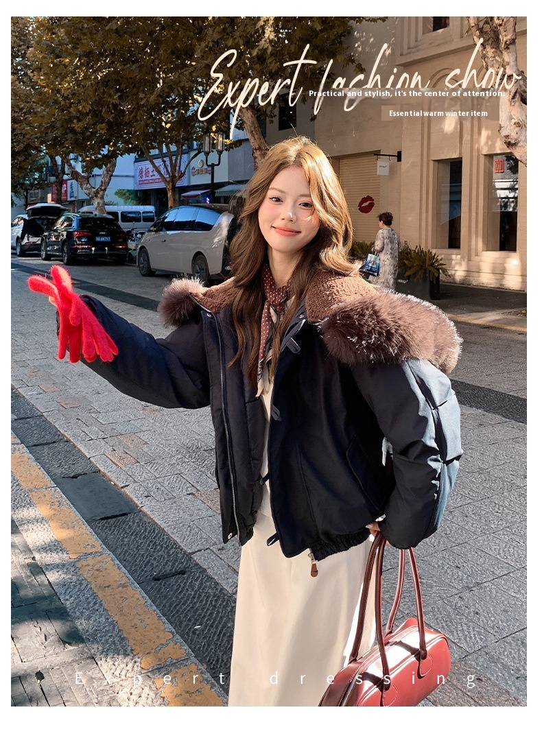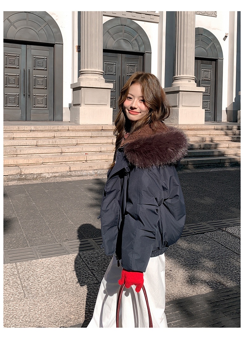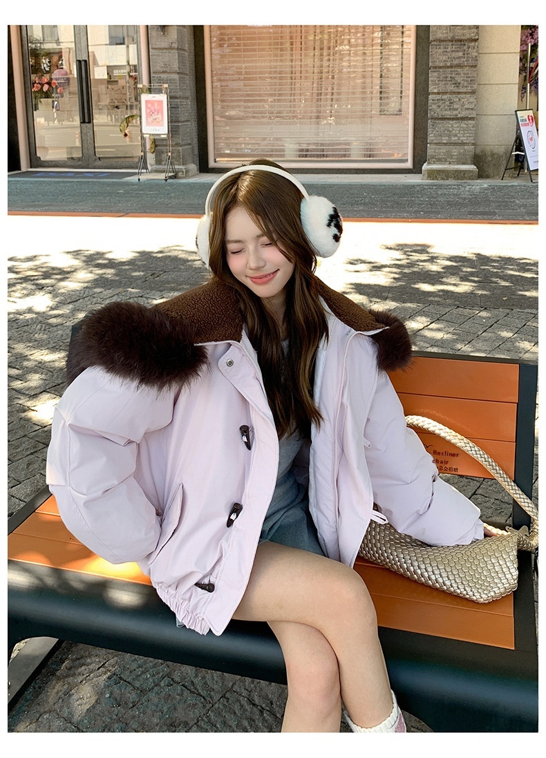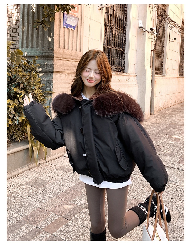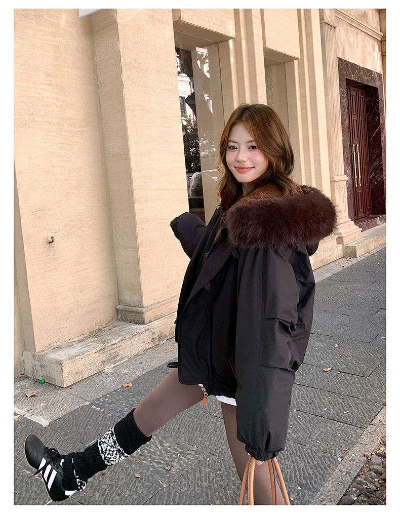 Big Fur Collar Hooded Horn Button Cotton-padded Jacket Women's Casual Loose