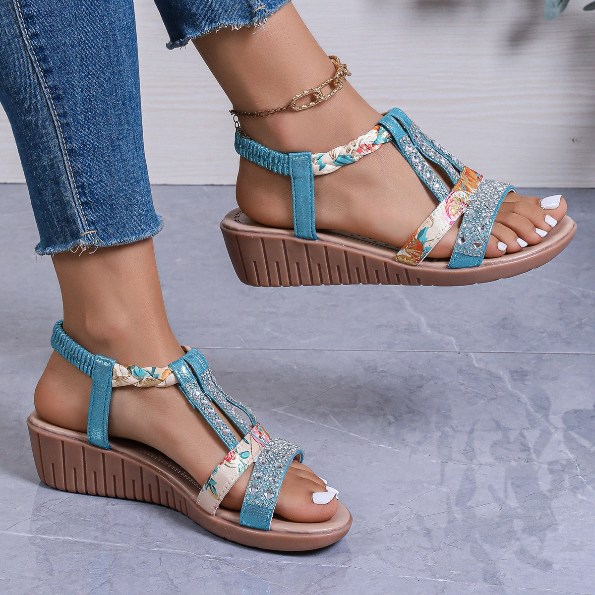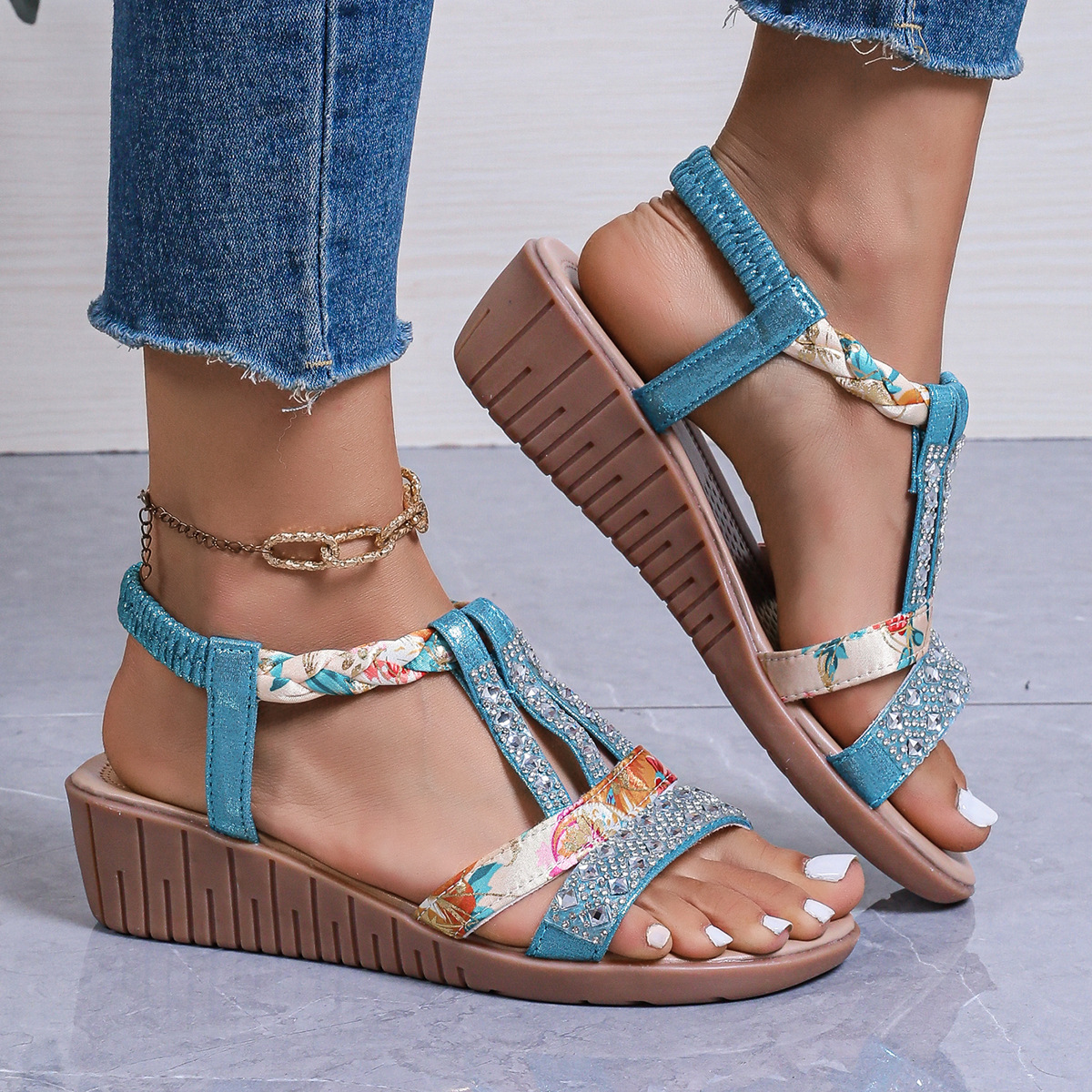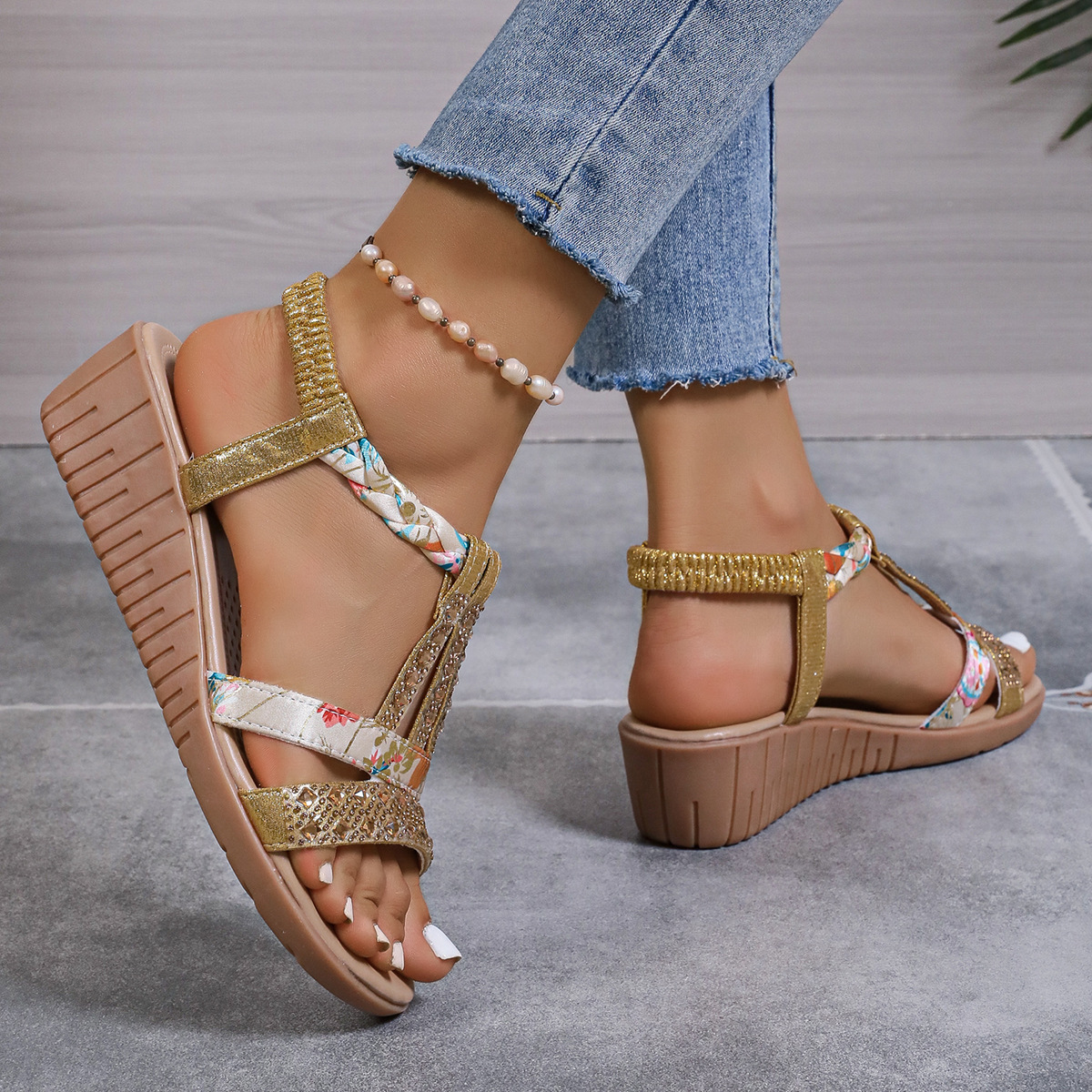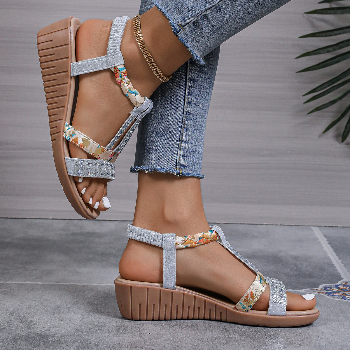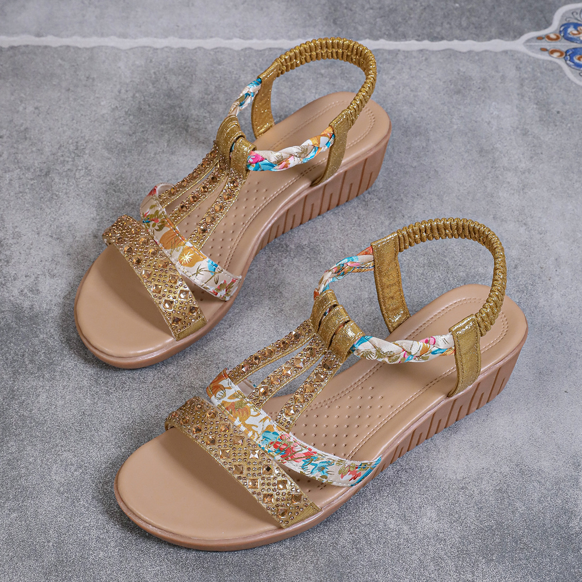 Bohemian Wedge Peep Toe Sandals Women's Fashion Outerwear Elastic Slip-on