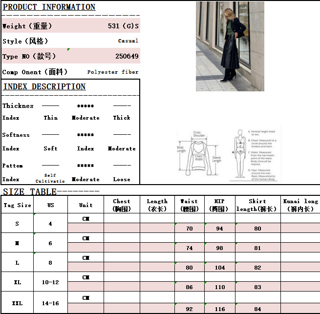 Fabric name: pu Skirt-type: high-waisted skirt Color: Black Elasticity: Micro-elastic Main fabric composition: Polyester (polyester fiber) Size: S,M,L,XL,XXL Style type: temperament commute Skirt length: mid-length skirt Skirt Category: skirt Popular elements: solid color Style: Elegant style