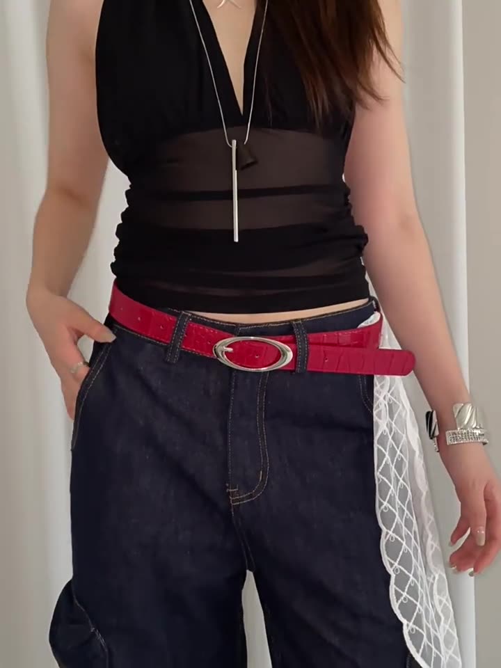 Fashion Lychee Pattern Belt Women's Oval Buckle Red High-grade All-matching