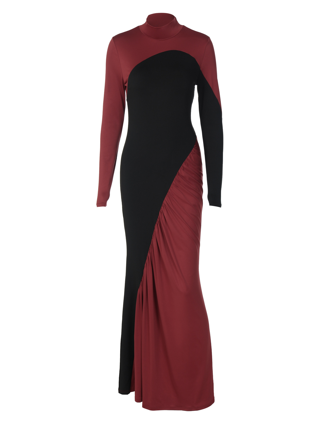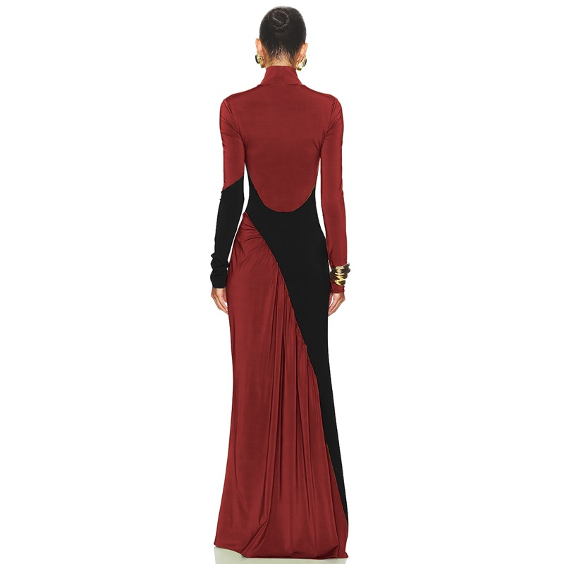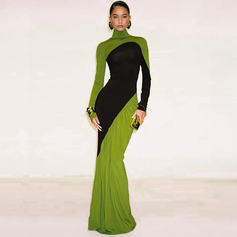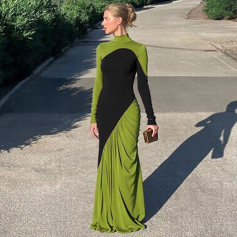 Fashionable Slim-fit Turtleneck Design Long Sleeve Contrasting-color Dress