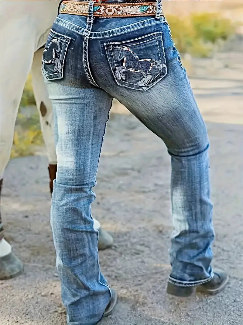 Hatchet Man Embroidery Women's High Waist Stretch Heavy Industry Washed Denim Straight-leg Trousers