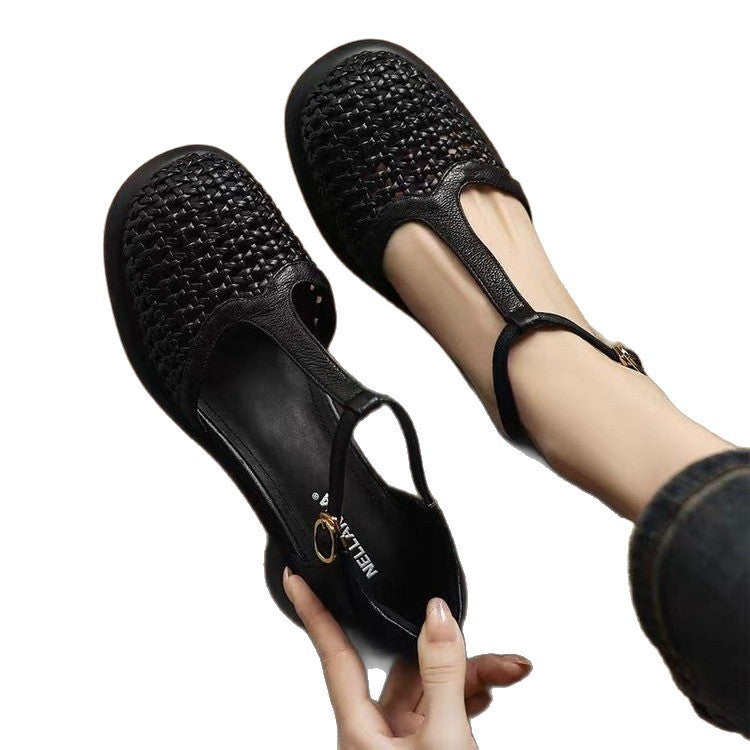 New Summer Soft Leather Roman Platform Mary Jane Shoes Hollow High Heel Pumps