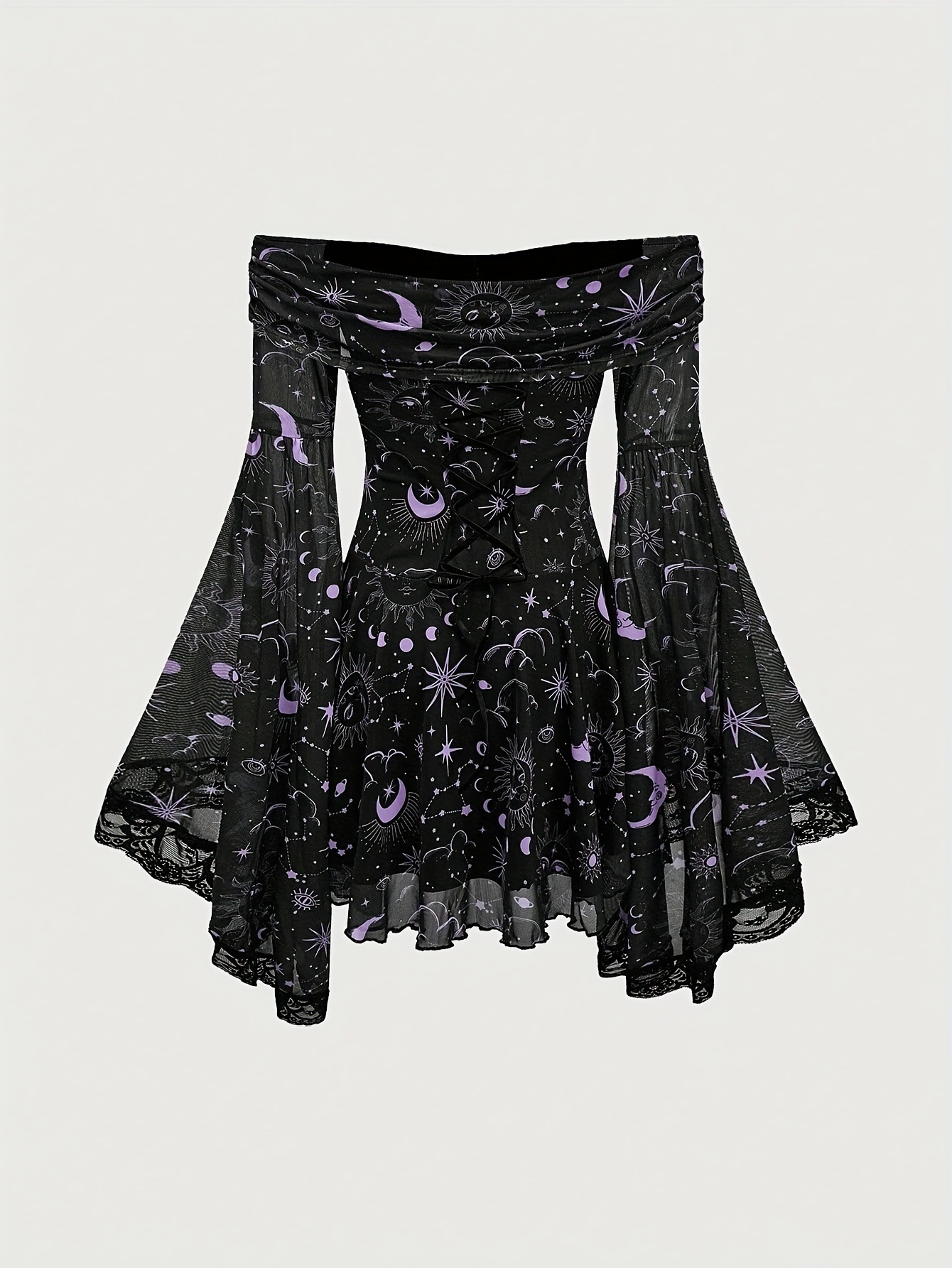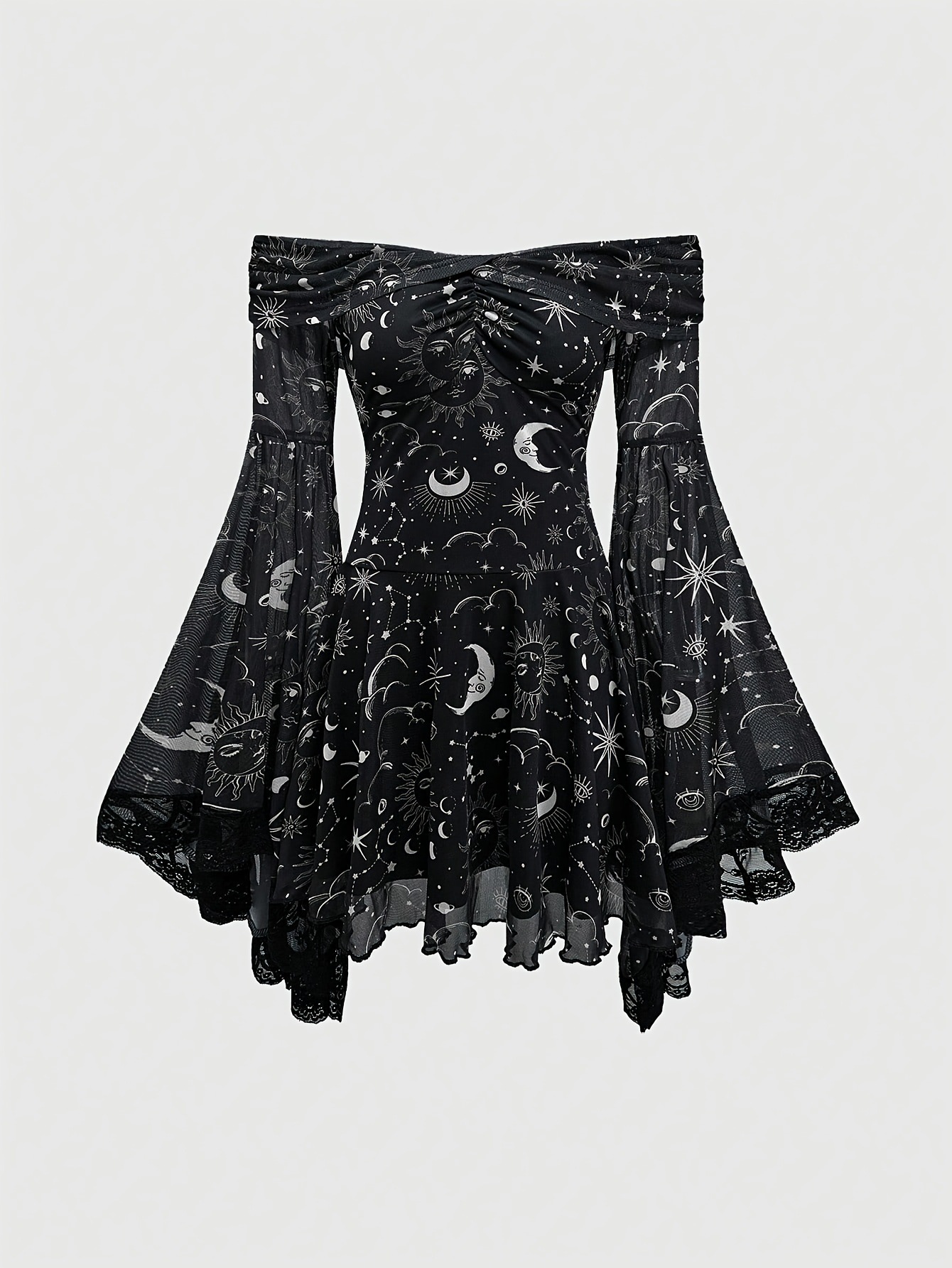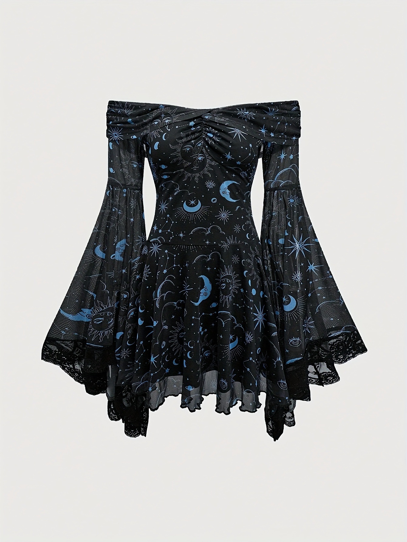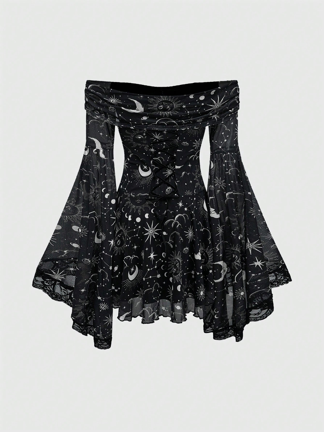 Off-the-shoulder Short Sleeve Flared Sleeves Mesh A- Line Dress