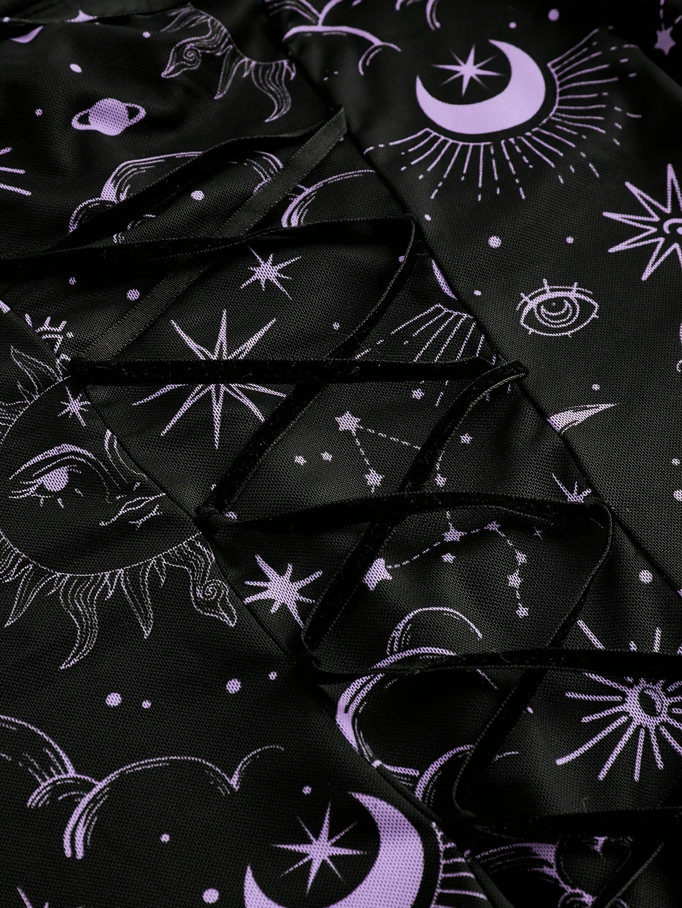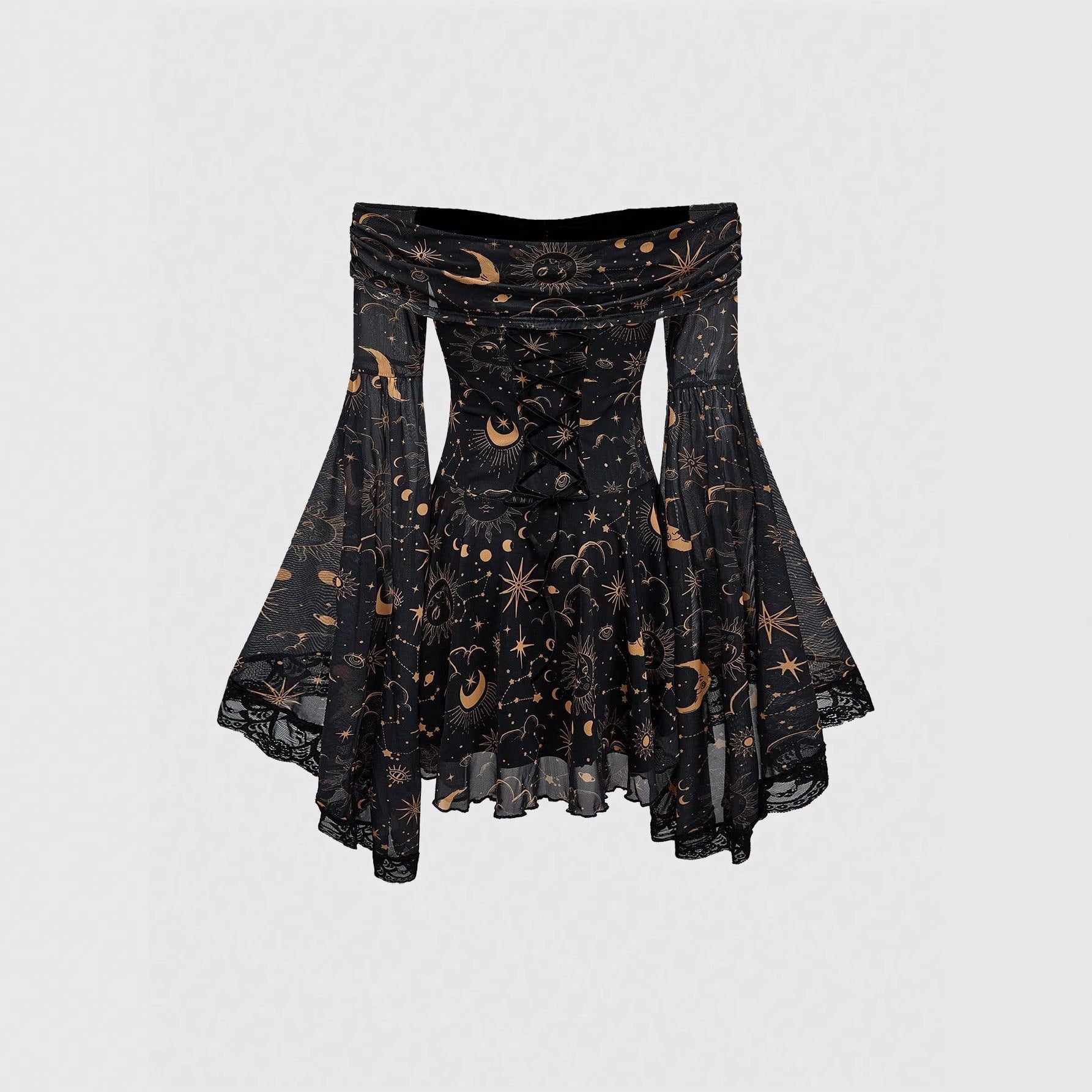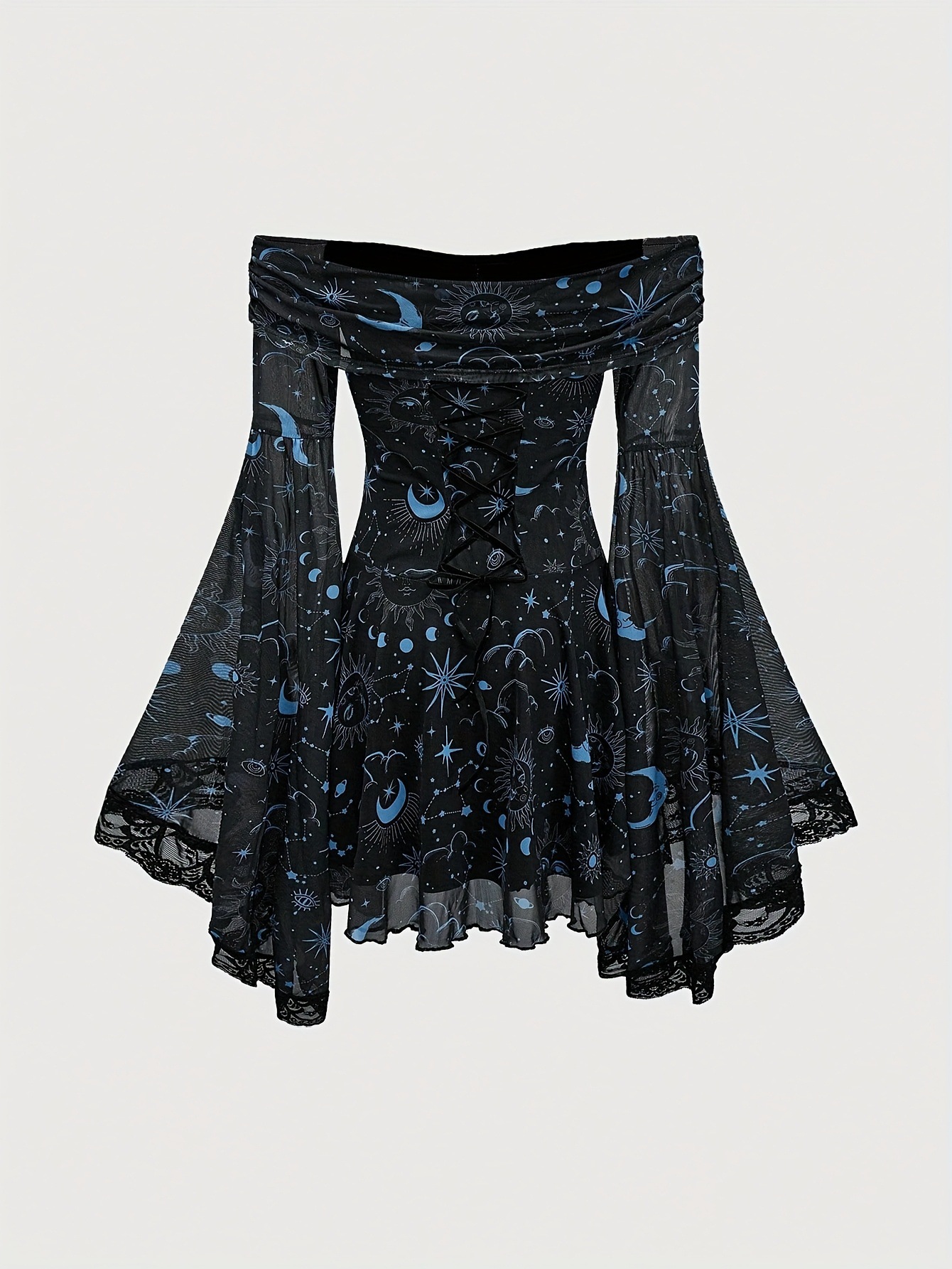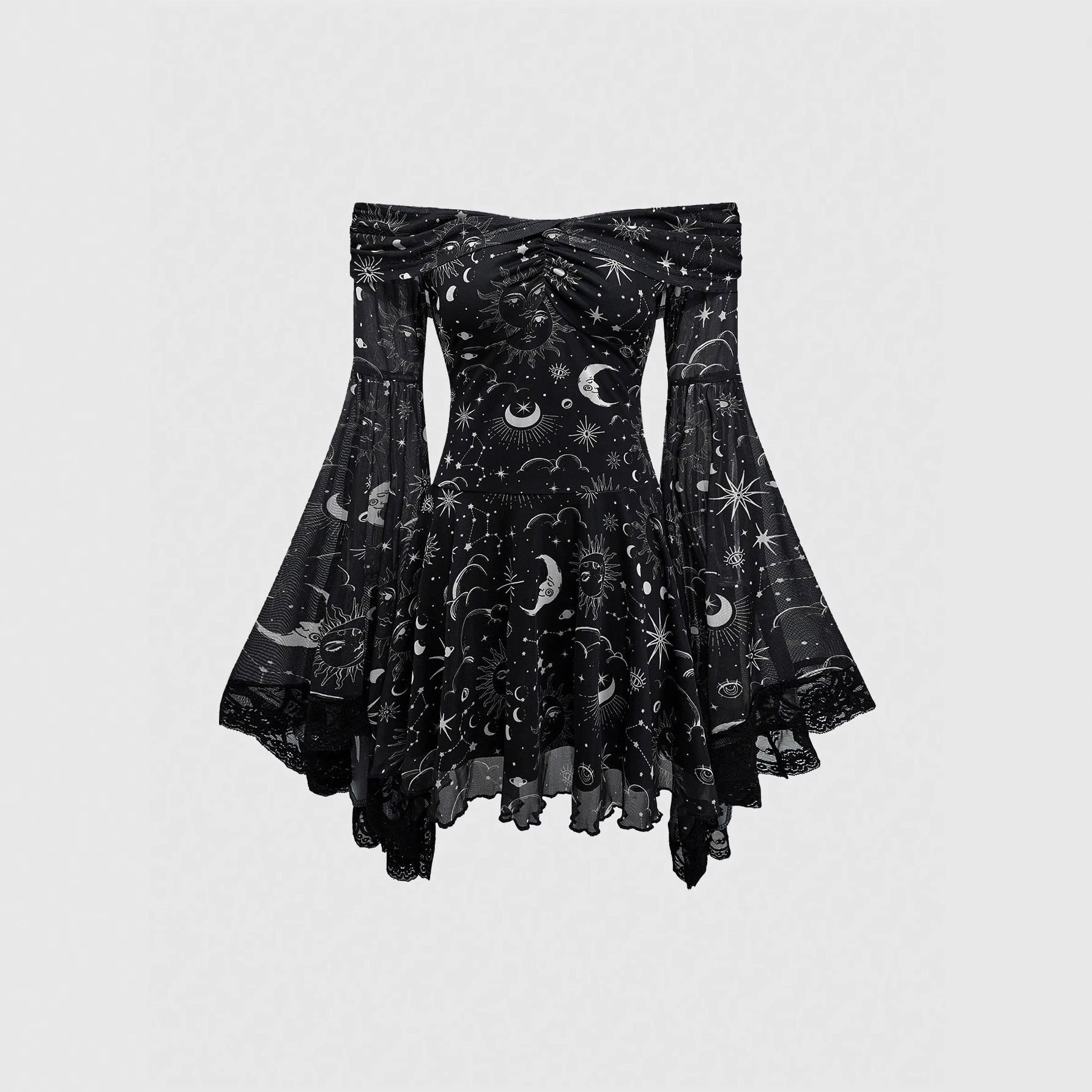 Off-the-shoulder Short Sleeve Flared Sleeves Mesh A- Line Dress