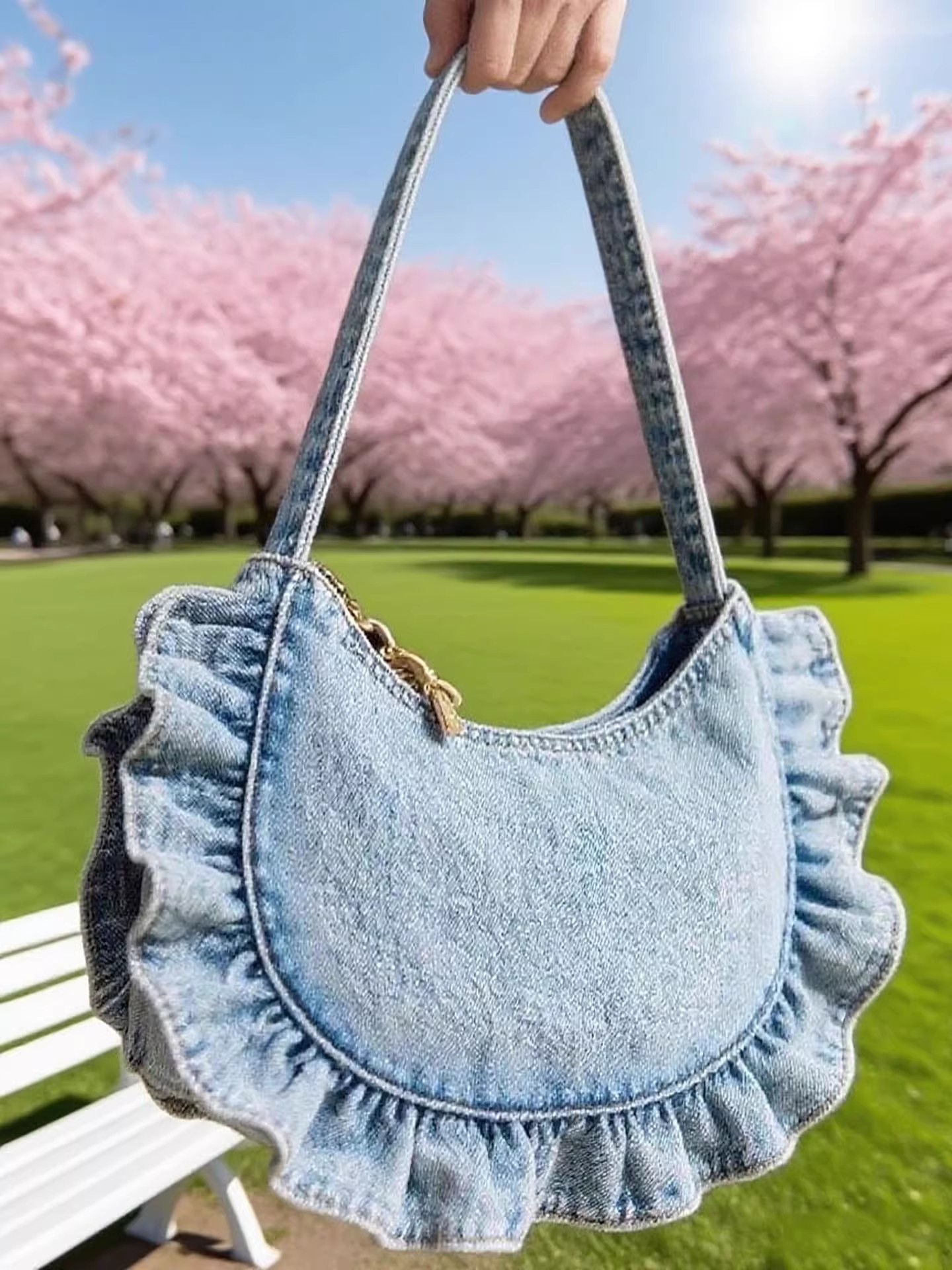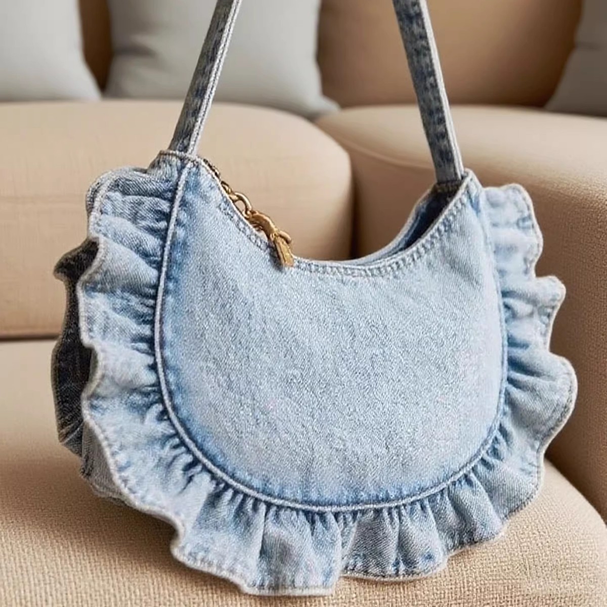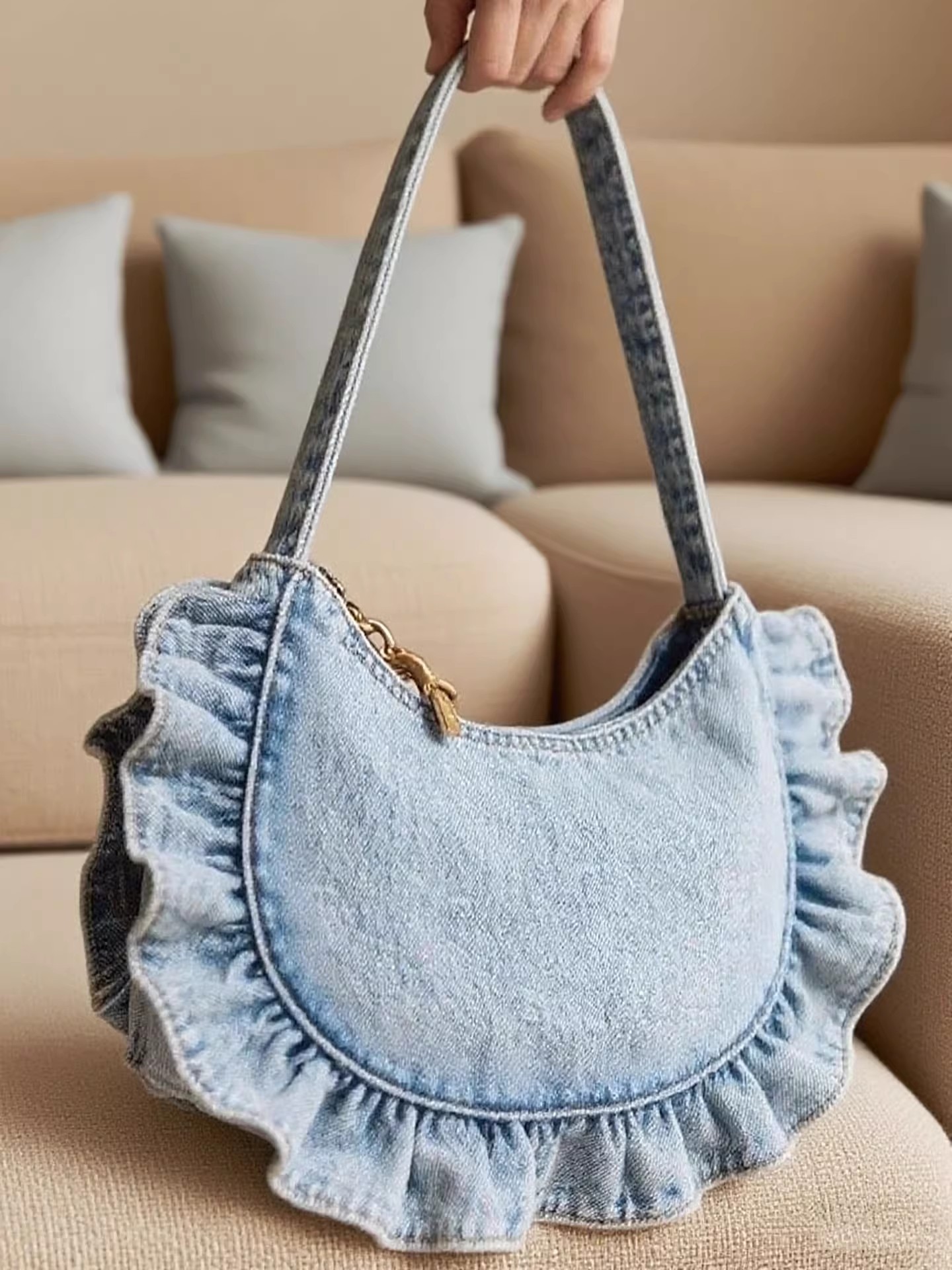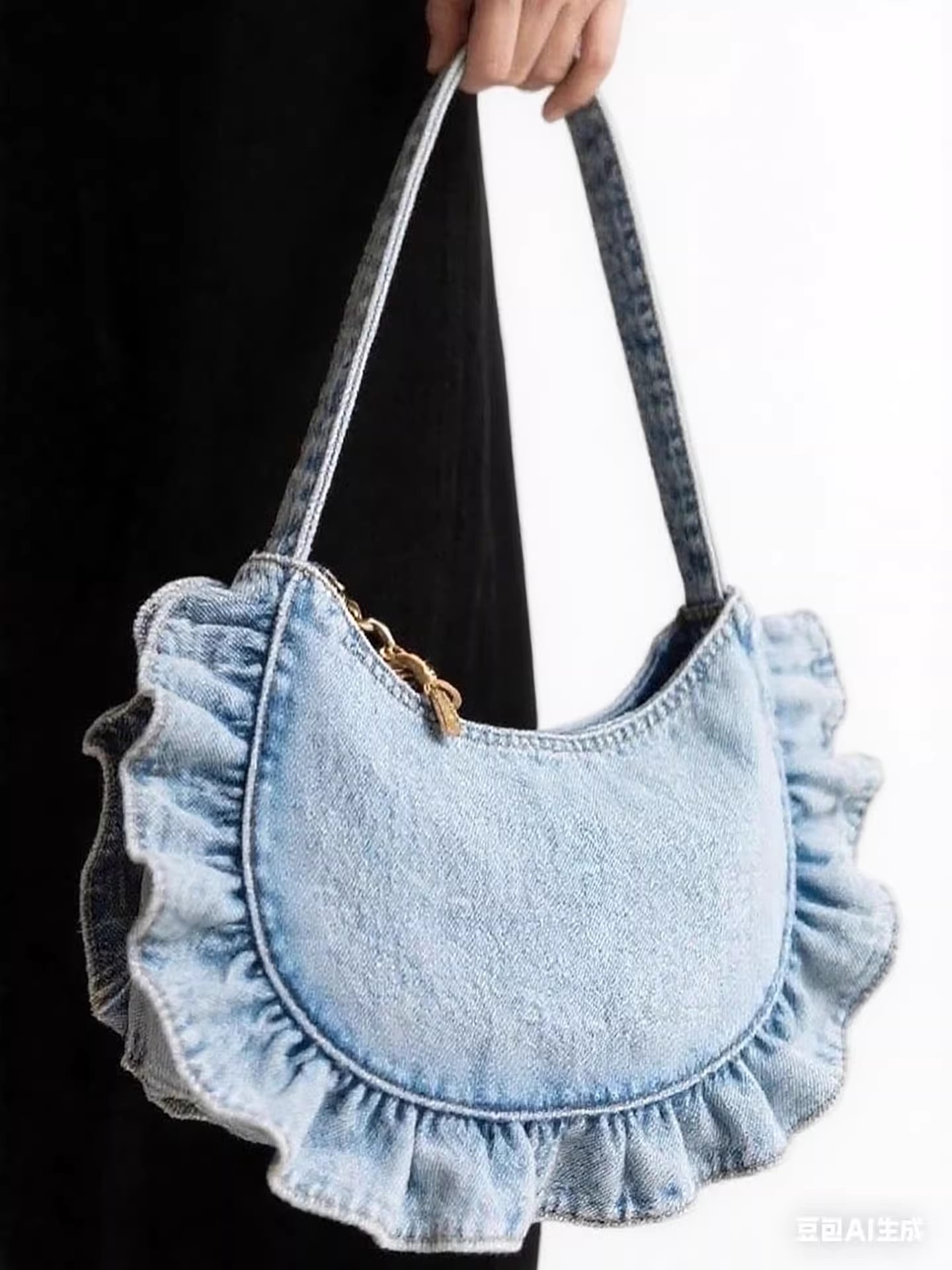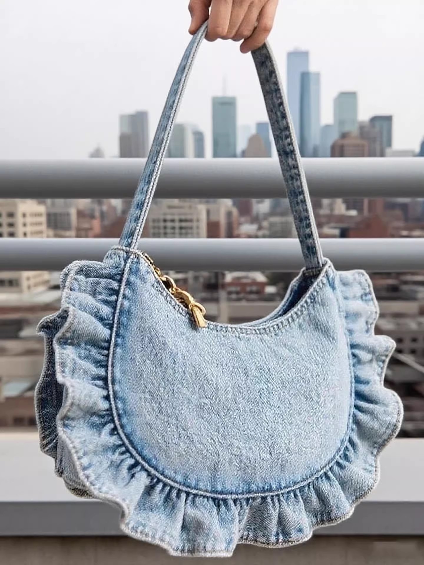 Polyester Women's Denim Lace Pleated Cross-body Bag