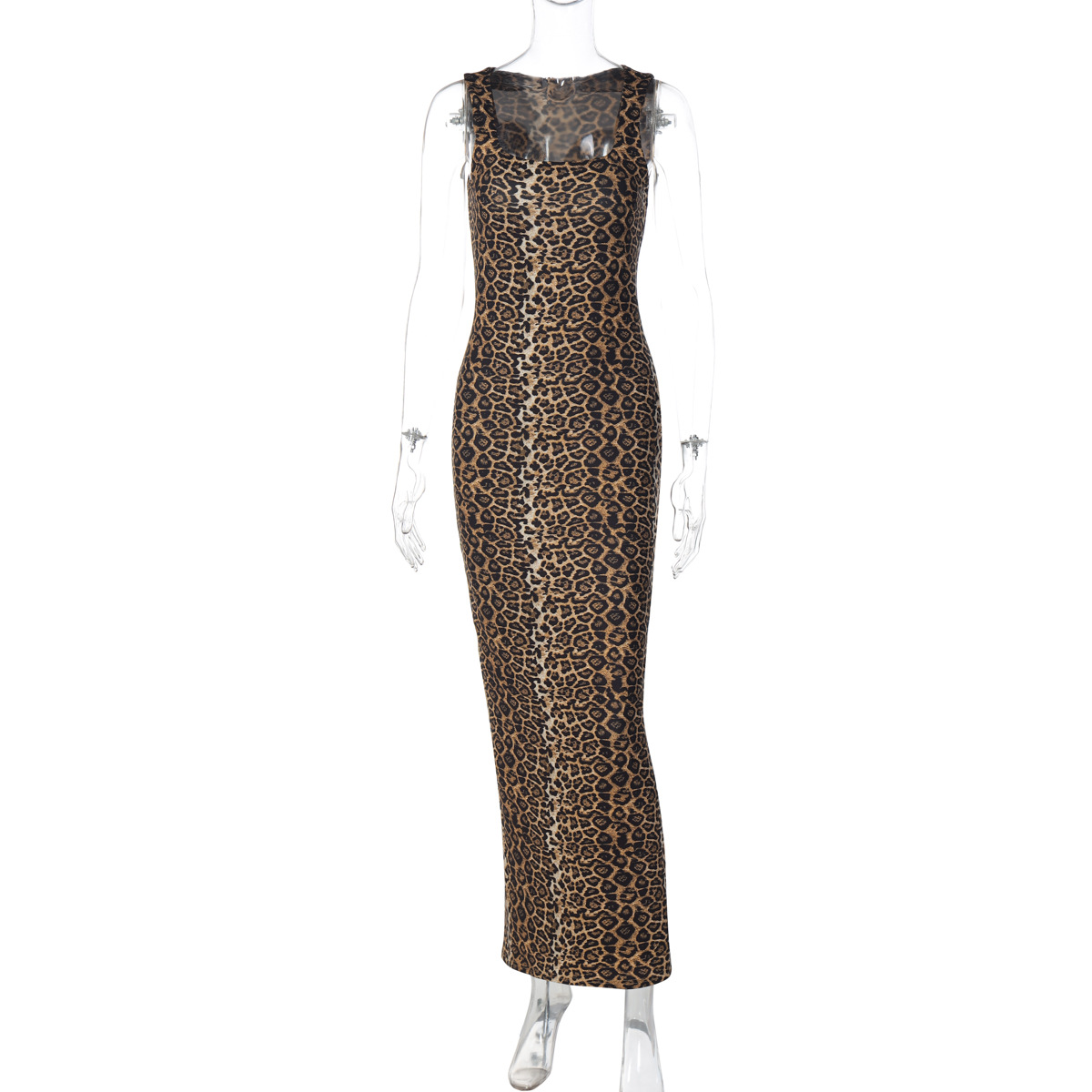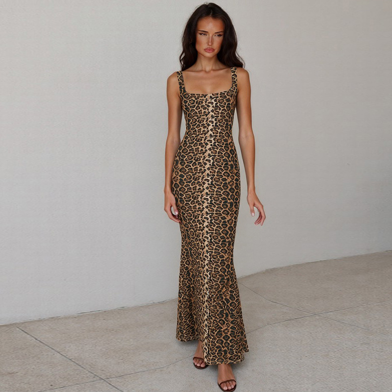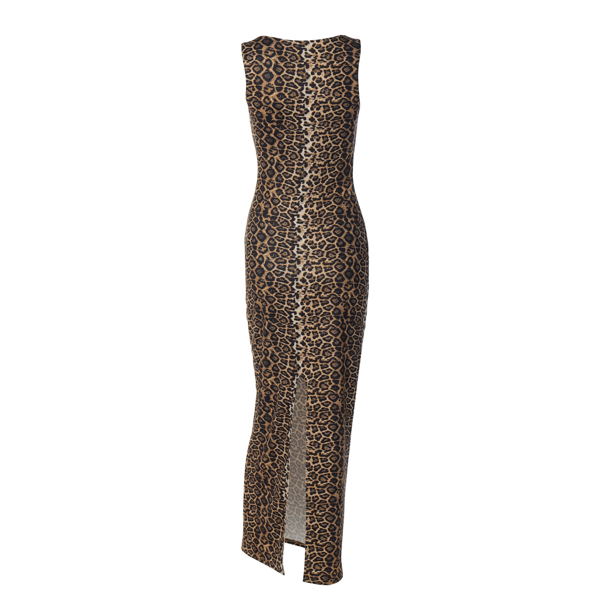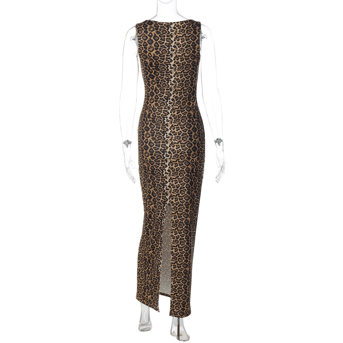 Printed Waist-controlled Stretch Split Sheath Leopard Print Dress