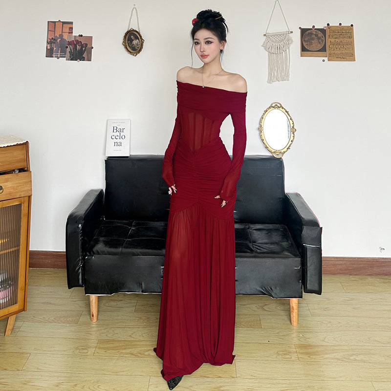 Purple Mesh Dress Off-shoulder Fishbone Waist