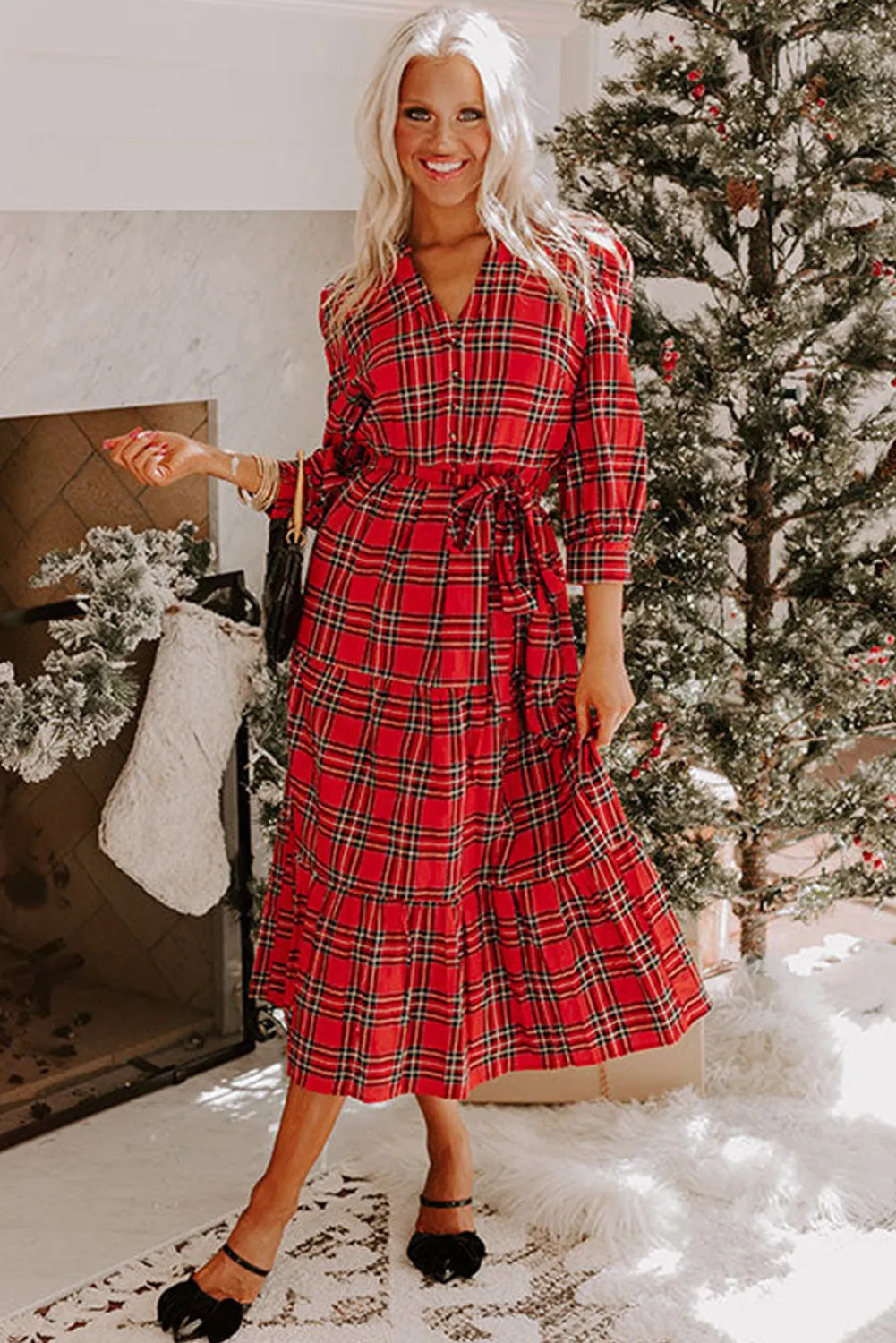 Red Christmas Plaid V-neck Dress