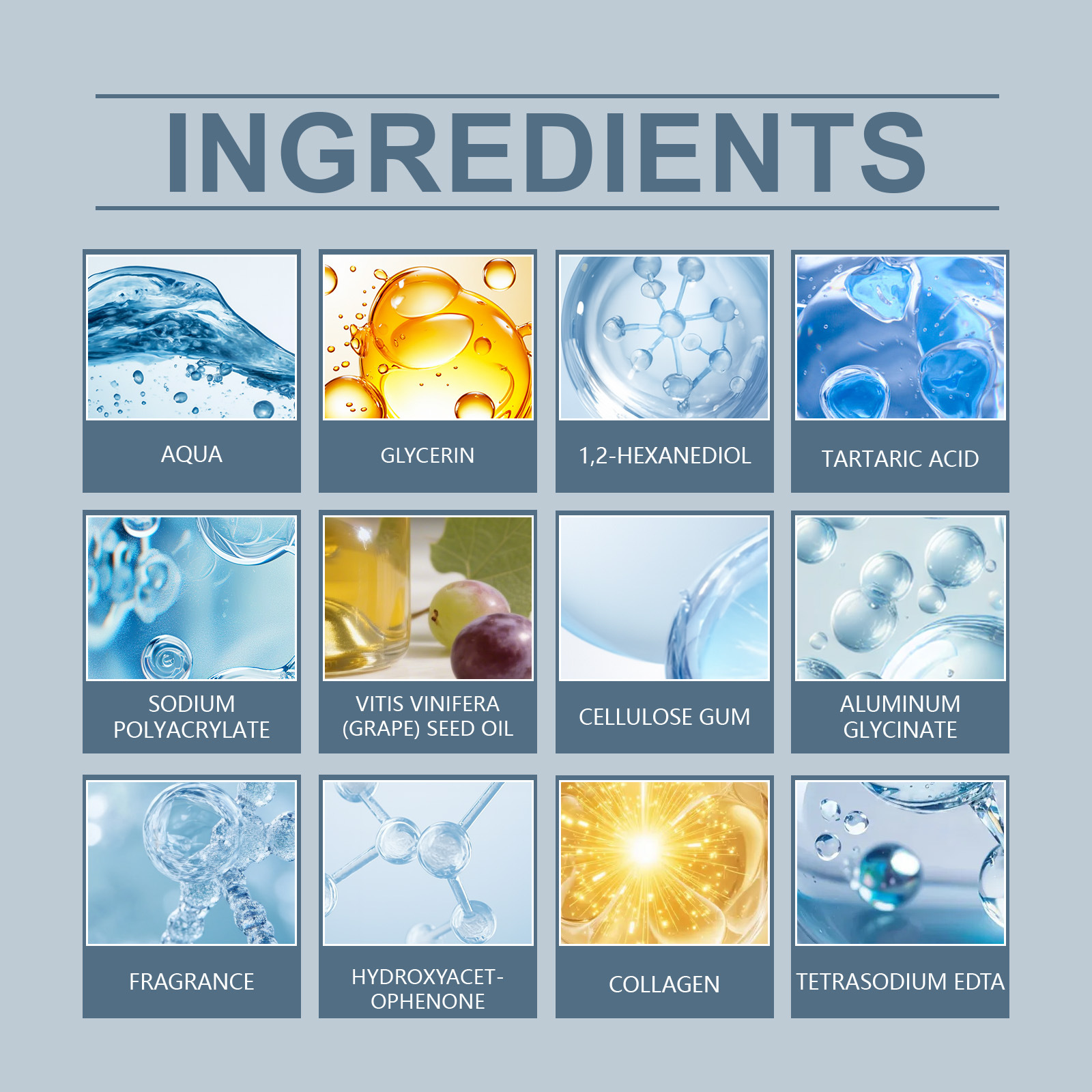 Product ingredients: water, glycerin, 1,2-hexanediol, tartaric acid, sodium polyacrylate, grape seed oil, cellulose gum, aluminum glycine, essence, p-hydroxyacetophenone, collagen, EDTA disodium