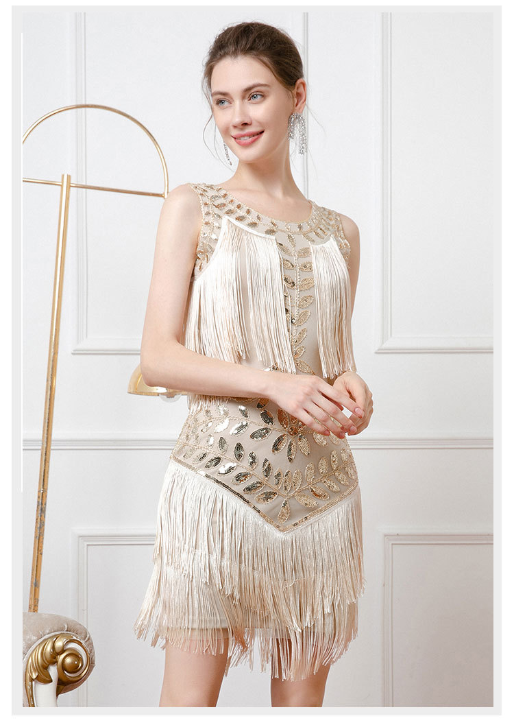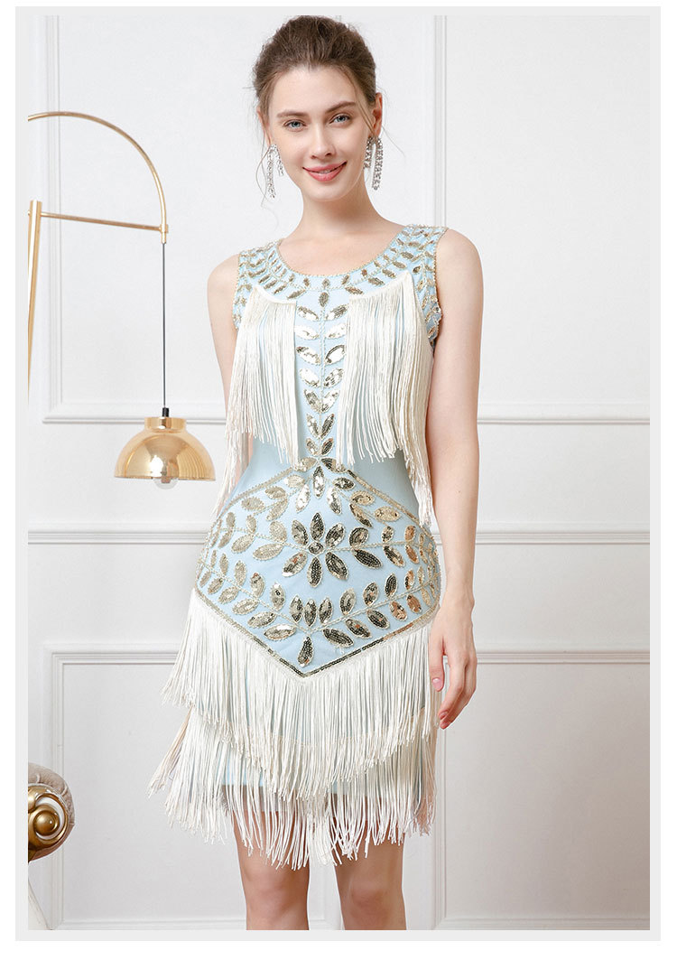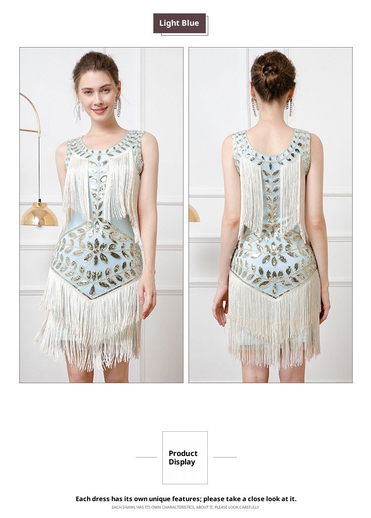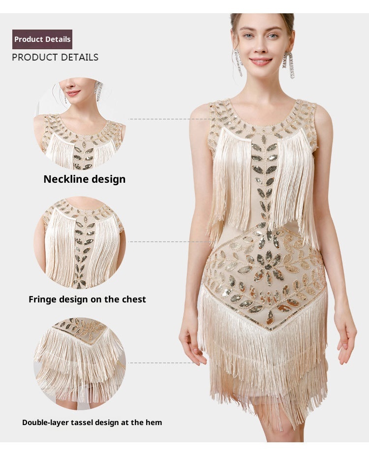 Retro Dance Sequined Vest Round Neck Pearl Embroidery Tassel Dress