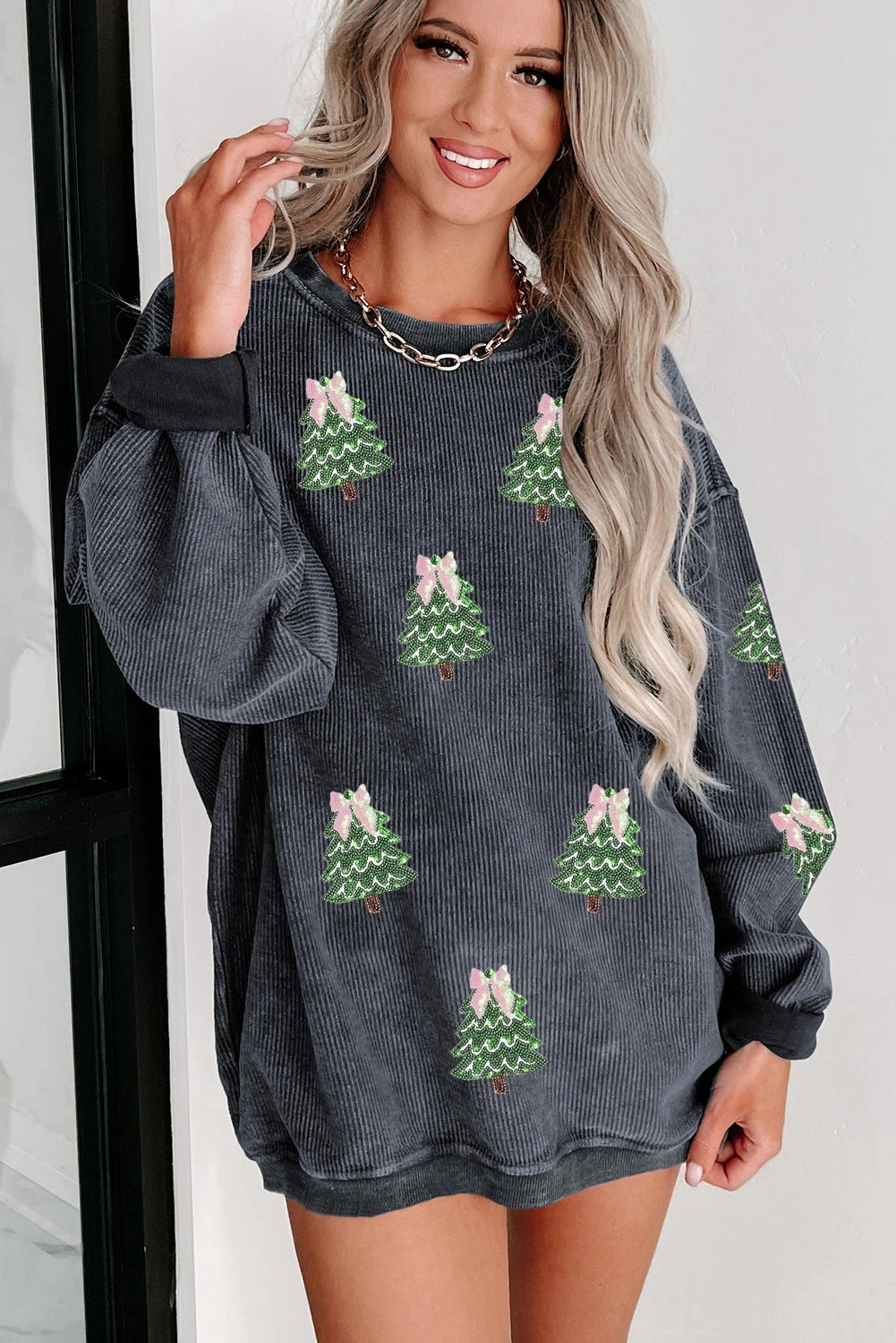 Round Neck Sequins Christmas Tree Rib Sweater For Women