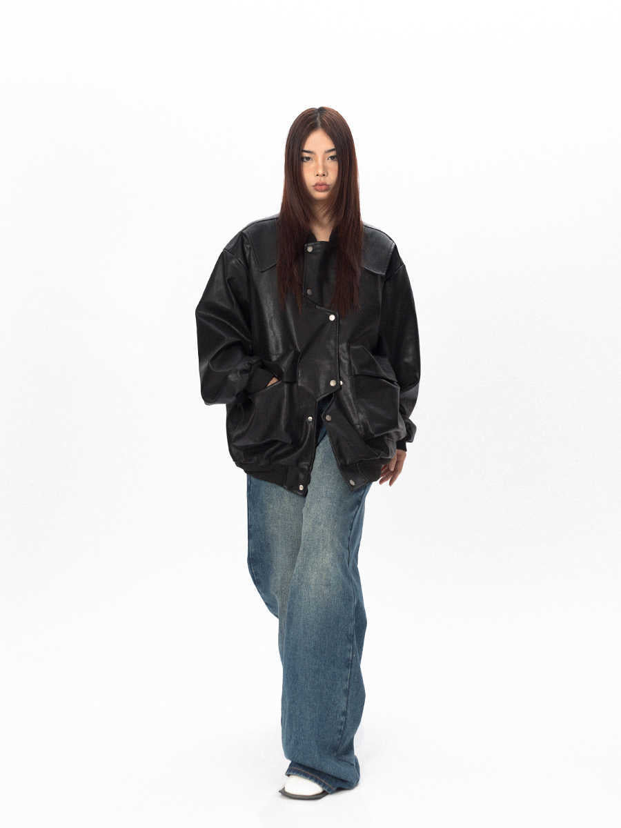 Three-dimensional Pocket Irregular Placket Leather Coat Loose Top