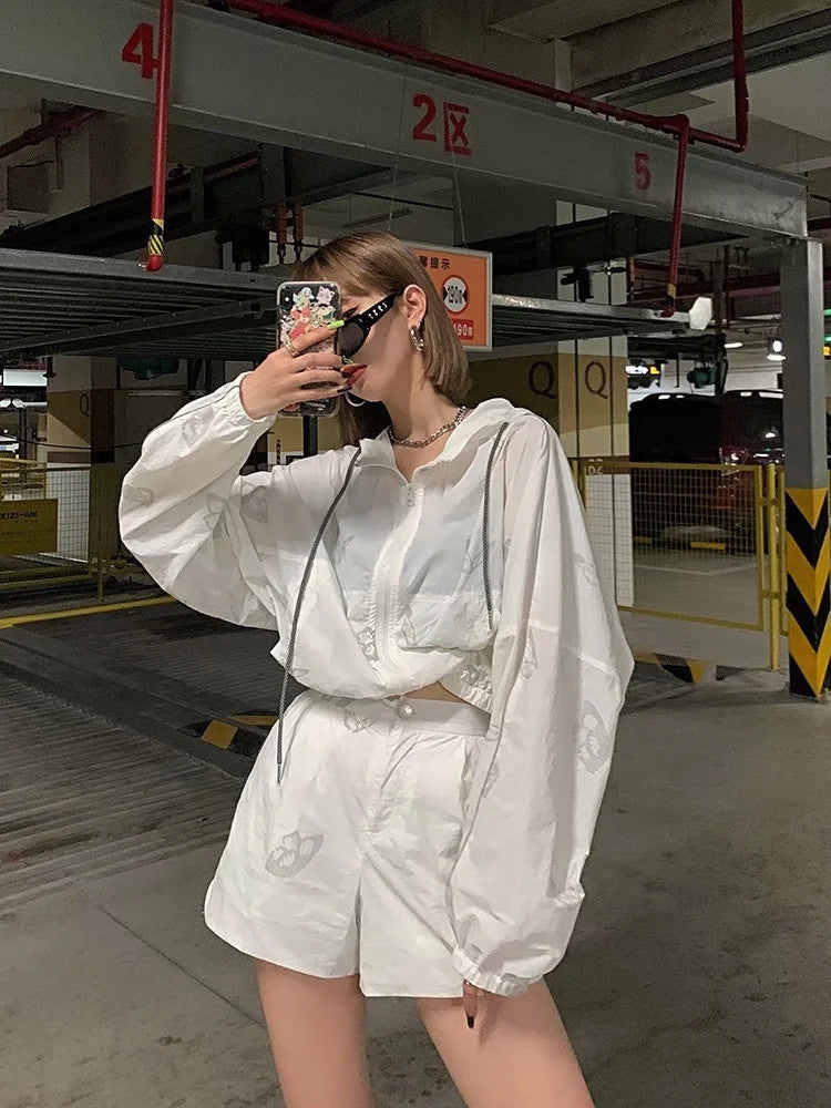 Two Piece Set Women Reflective Butterfly Print Playsuits Hoodies High Waist Lace Up Wide Leg Zip Shorts Loose