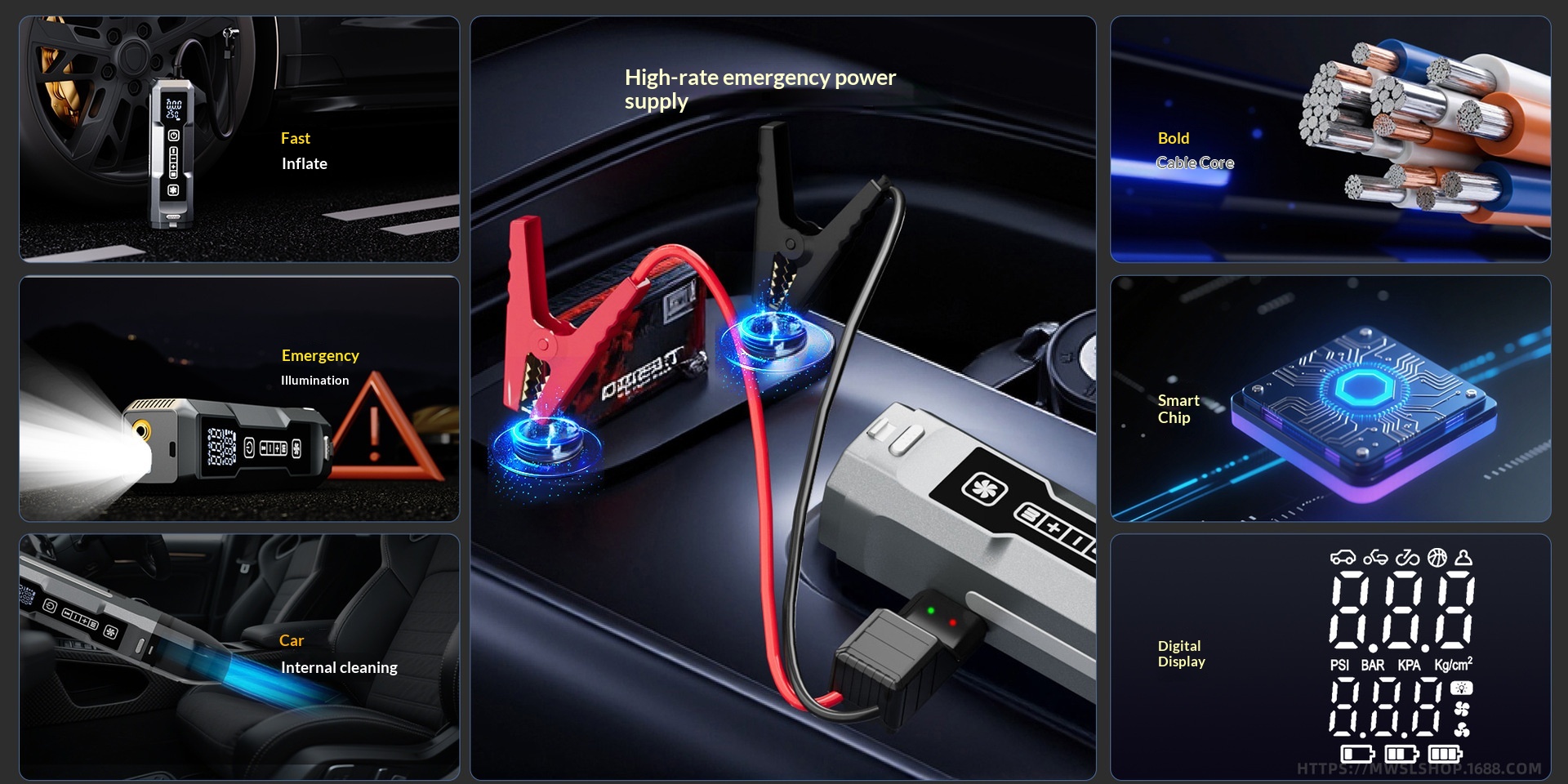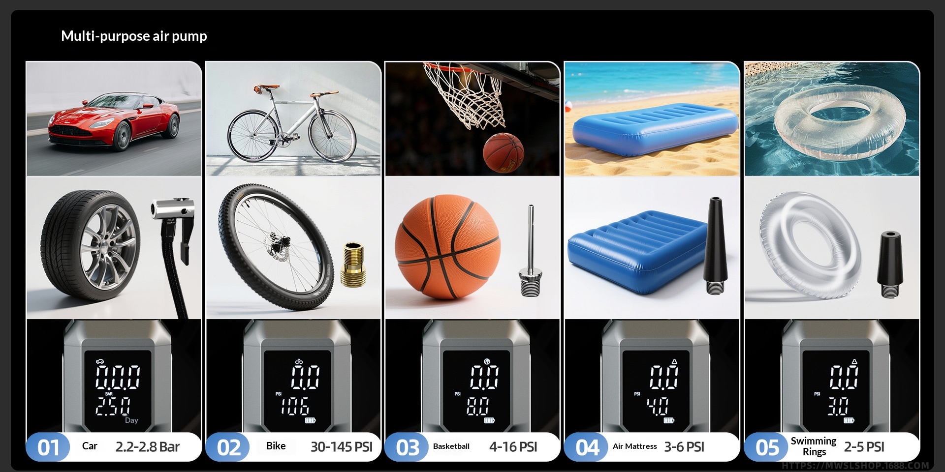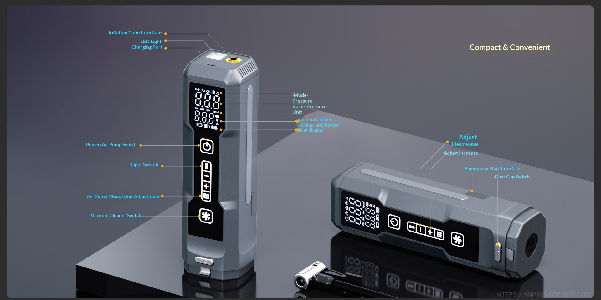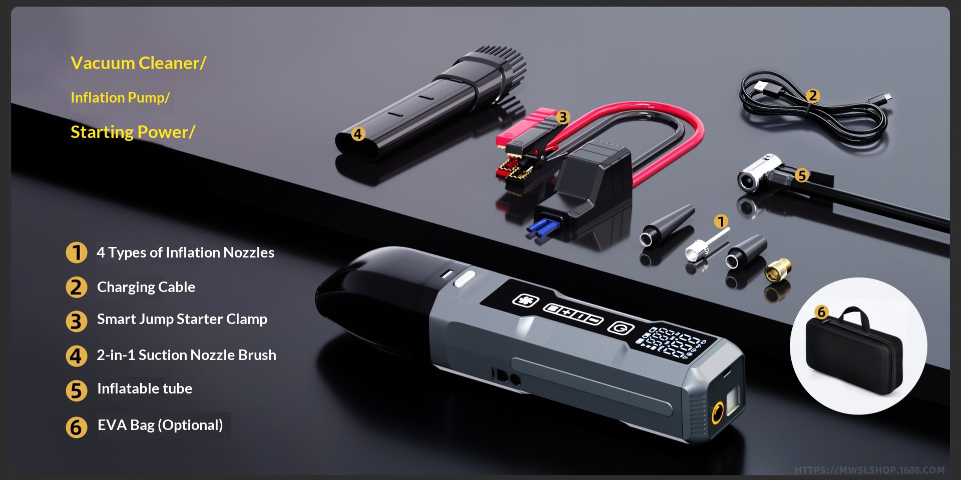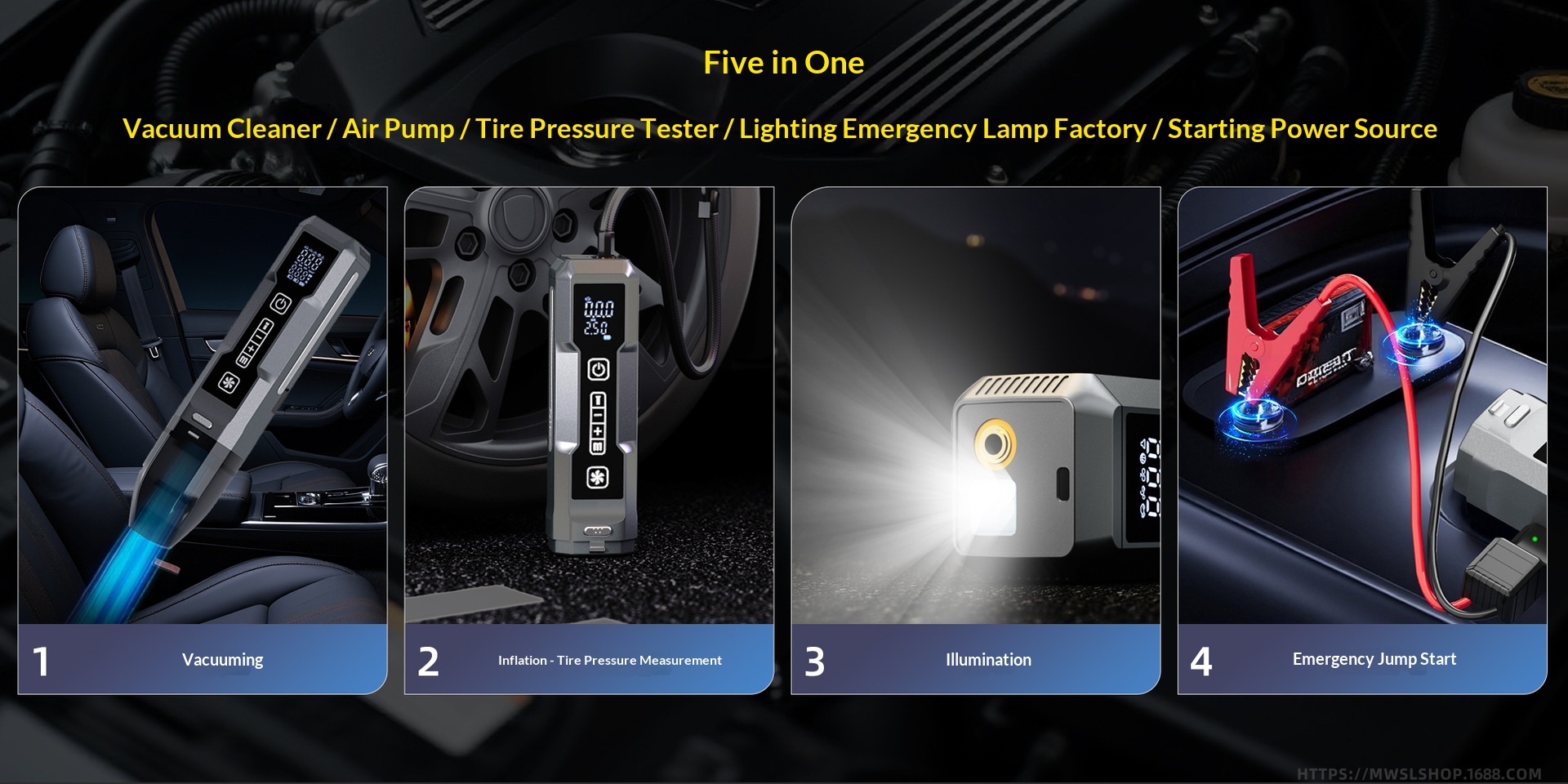 Color classification: Vacuum + inflation + tire pressure measurement + lighting (4-in-1), Vacuum + inflation + tire pressure measurement + lighting (4-in-1) + EVA bag, Vacuum + inflation + tire pressure measurement + lighting + power supply (5-in-1), Vacuum + inflation + tire pressure measurement + lighting + power supply (5-in-1) + EVA bag