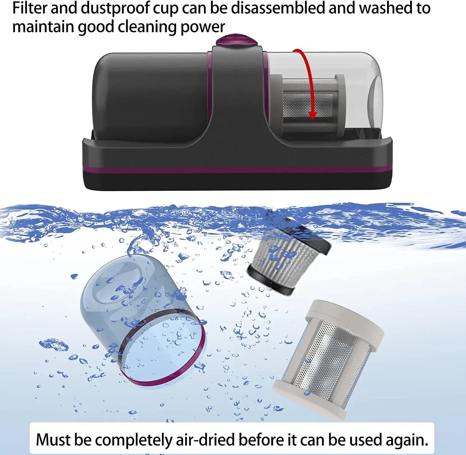 The vacuum filter element and dust cup on the bed can be cleaned directly, very convenient, easy to clean, let you use more at ease. (Please dry the dust-proof cup and filter element before continuing to use, otherwise it will affect the secondary use and cleaning)
