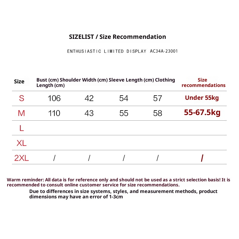 1. Asian sizes are 1 to 2 sizes smaller than European and American people. Choose the larger size if your size between two sizes. Please allow 2-3cm differences due to manual measurement. 2. Please check the size chart carefully before you buy the item, if you don't know how to choose size, please contact our customer service. 3.As you know, the different computers display colors differently, the color of the actual item may vary slightly from the following images.