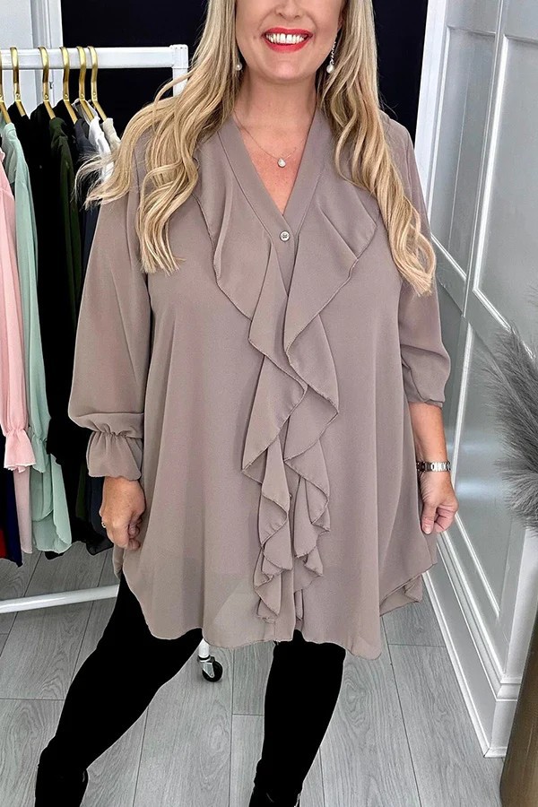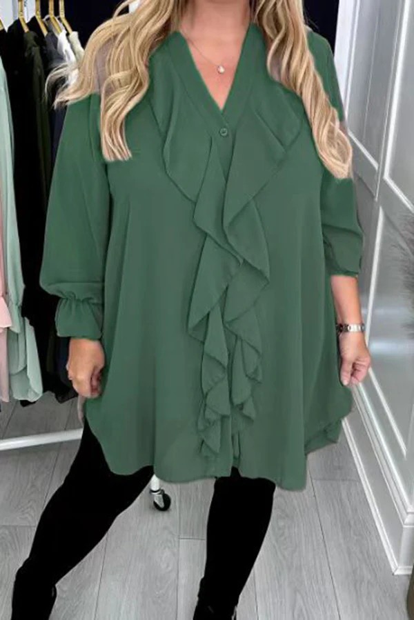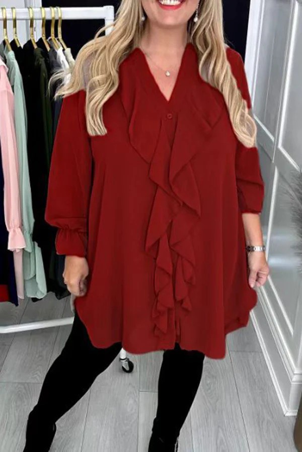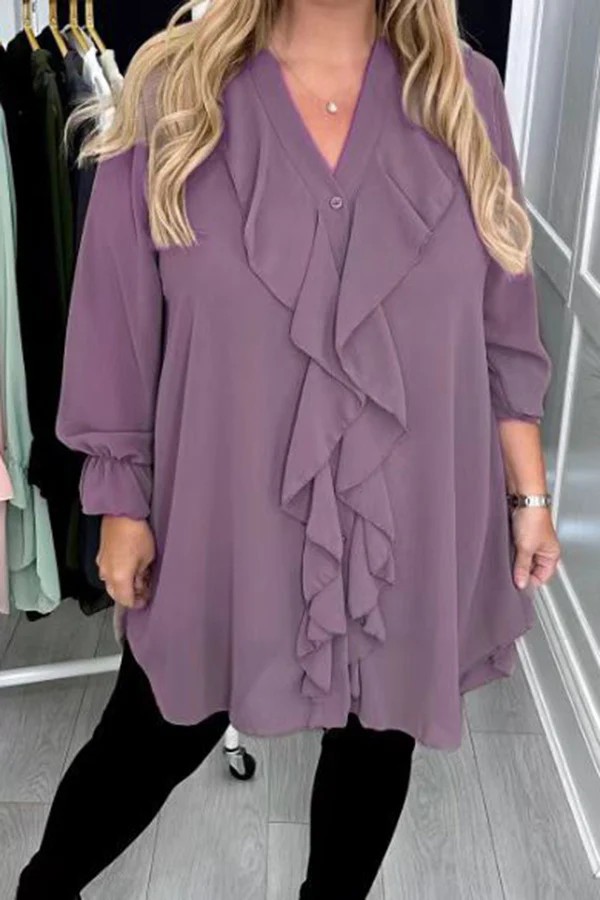 Women's Solid Color Loose Lotus Leaf V-neck Long Sleeve Shirt